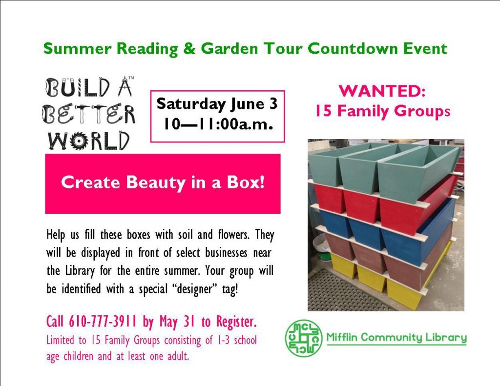 Combining the theme of the 2017 Summer Reading Program with a green thumb in anticipation of their Annual Garden Tour, the Friends Group of Mifflin Community Library is planning an event to engage families and beautify Lancaster Avenue in Shillington. Build a Better World – Create Beauty in a Box will take place on Saturday, June 3 from 10 am to 11 am in the library parking lot at 6 Philadelphia Avenue. Fifteen family groups will plant colorful annuals in handcrafted flower boxes that will be displayed throughout the summer at designated businesses, including M&T Bank, Renninger’s Accounting, Avenue 4 Accessories, Ann’s Nails, the Borough Hall and several others.