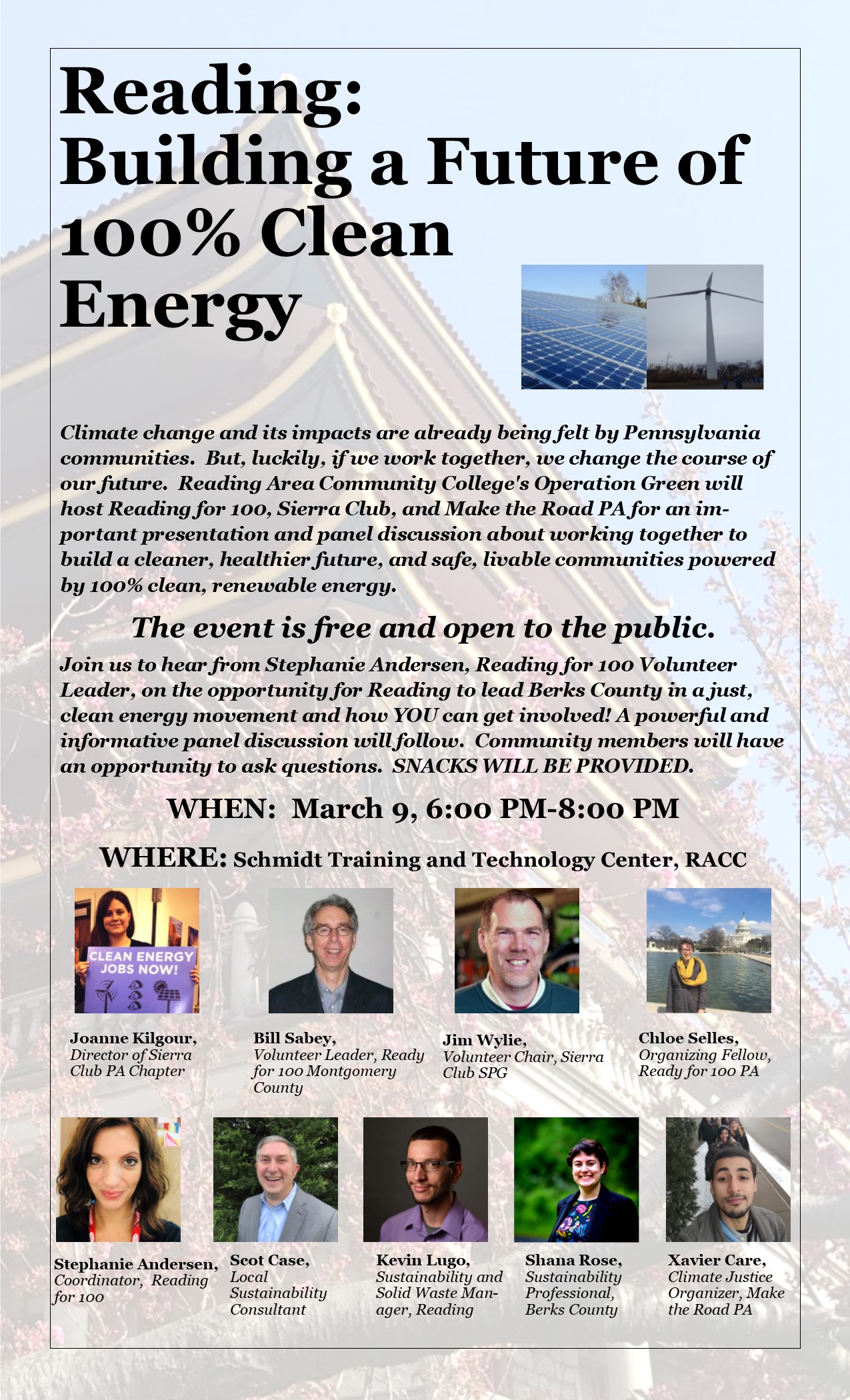 Join us to hear from Stephanie Andersen, Reading for 100 Volunteer Leader, on the opportunity for Reading to lead central PA in a just, clean energy movement and how YOU can get involved! A powerful and informative panel discussion will follow. Community members will have an opportunity to ask questions.
