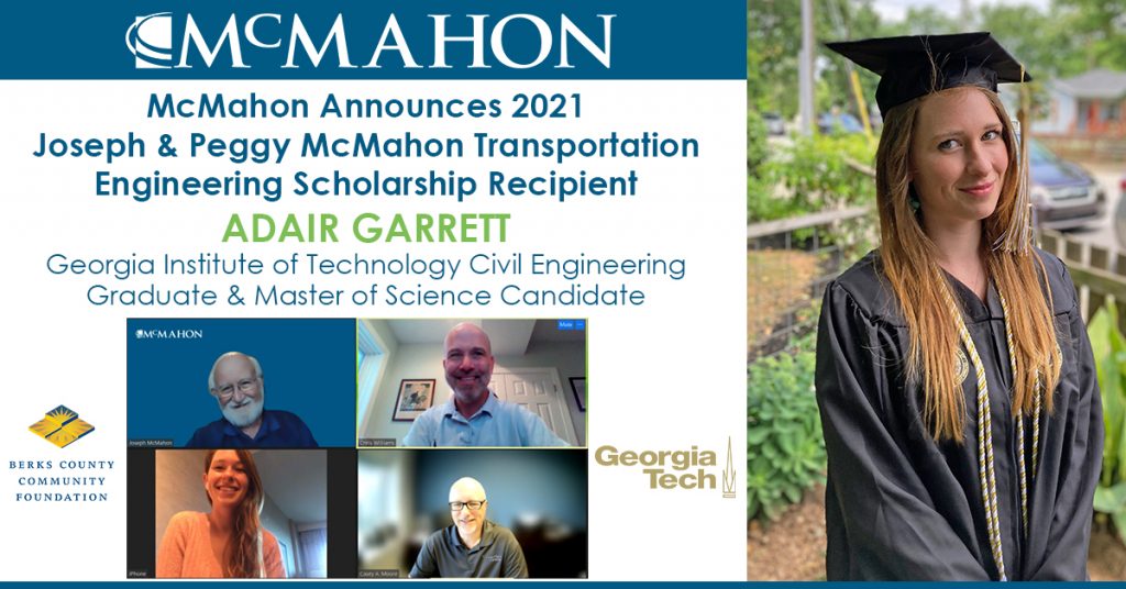McMahon Associates, Inc., a transportation engineering and planning firm, is pleased to announce that the recipient of the 2021 Joseph and Peggy McMahon Transportation Engineering Scholarship is Adair Garrett, a May 2021 graduate of the Georgia Institute of Technology with a Bachelor of Science degree in Civil Engineering. She will continue to pursue her Master of Science degree in Civil Engineering with a transportation engineering concentration over the next two years. This scholarship award is competitively selected through the Berks County Community Foundation.