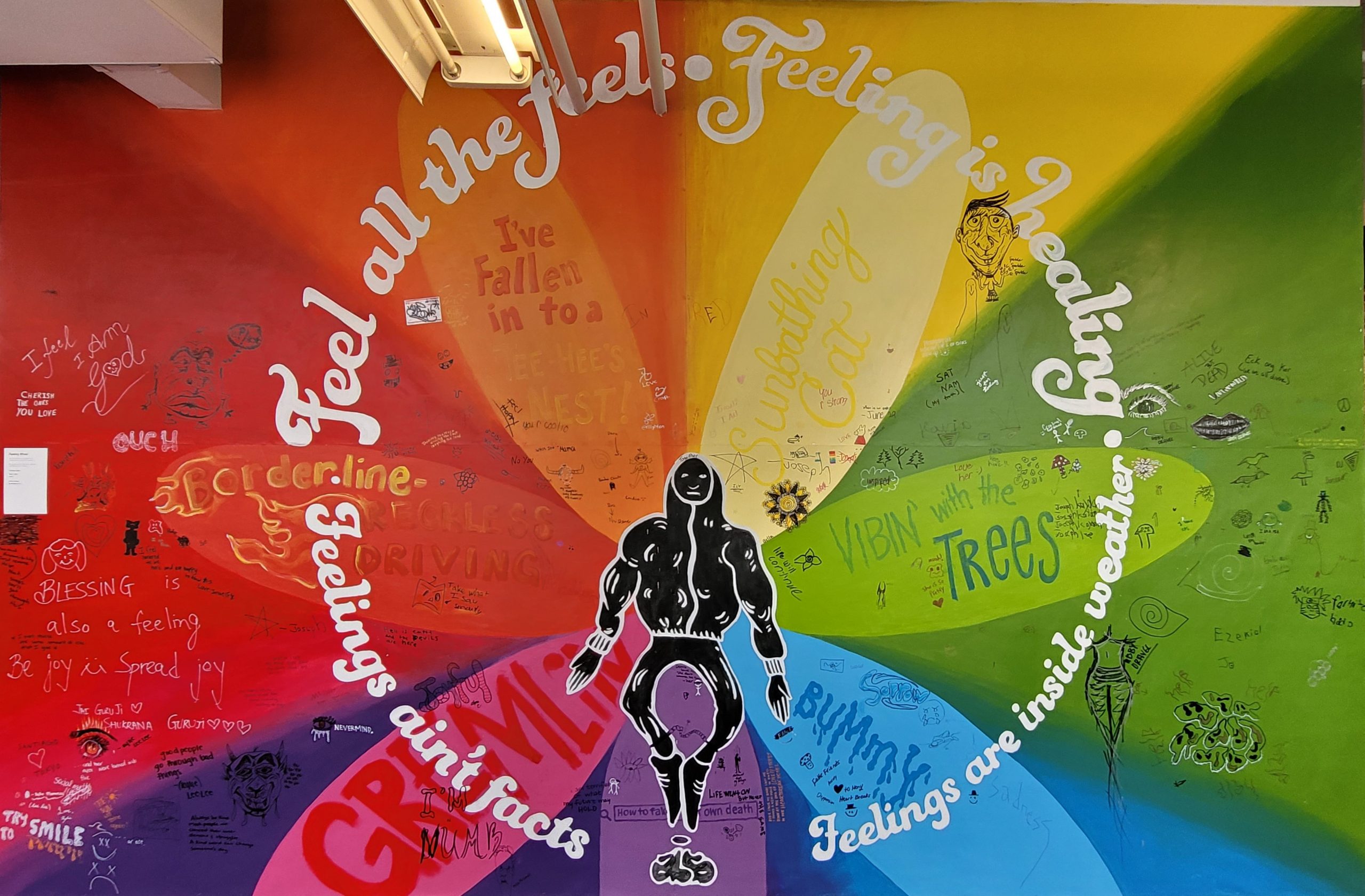 Most of the interactive elements are invented and hand-crafted by Ann Lemon and Dane Burkhart, such as Chromatic Data (a wall where visitors can decorate and post tiles detailing their everyday “strengths” and “stressors”) and the Feeling Wheel (for people to identify and illustrate a present feeling). The exhibit has already seen great success during group tours with Caron patients, Olivet Boys & Girls Club, and RACC students.