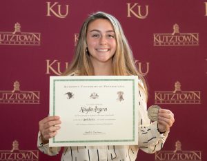 Rylee Derr is from Lititz, Pa. and graduated in December with dual degrees in special education and elementary education. She was awarded the Chambliss Academic Achievement Copper Medal for noteworthy achievements in athletics. Derr has been a starter and member of the KU women’s basketball team since 2017 and led the Golden Bears to two PSAC East titles, two PSAC Final Four appearances and the program’s first NCAA Tournament since 1996. Derr is the all-time leading scorer in KU women’s basketball history. She also holds the school record for three-pointers made in a game, season and career. She is a three-time All-PSAC selection, was the KU Freshman of the Year and has made the Dean’s List and been named a PSAC Scholar-Athlete every year. She was the team captain this season and returned to complete her four years of athletics due to COVID-19. In doing so, she is pursuing her master’s degree in education and her reading specialist certification. Derr aspires to become a teacher and remain involved in basketball.