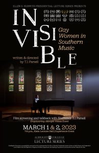 Albright College is pleased to announce the screening of “Invisible, Gay Women in Southern Music” (2021, 1:47 min.) written and directed by T.J. Parsell for two free showings on Wednesday and Thursday, March 1-2, 7-9 p.m., Klein Lecture Hall (CFA 235). Both evenings will feature a short response by faculty at the end of the screening, and both evenings are Experience events for students, with both being free and open to the public.