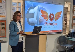 Kryn McClain, co-founder of Paragon Behavioral Health, a startup that produces educational virtual reality content to teach life skills for a fully immersive learning experience, presents her pitch at the Berks LaunchBox. Credit: Berks LaunchBox. All Rights Reserved.