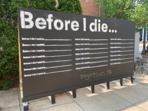 “Amy Muzopappa, a member of Studio B’s Advisory Council, became acquainted with the ‘Before I Die’ project when we were considering ways to involve the community during our annual art exhibit and book release,” explains Jane Stahl, Studio B’s Director of Community Relations. “She and Judy Wetzel had seen a ‘Before I Die, I Want to…’ mural wall during their trip to Alaska and were inspired by the concept and, while there, added their own wishes.
