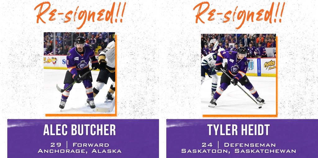 The Reading Royals, proud ECHL affiliate of the Philadelphia Flyers and Lehigh Valley Phantoms, announced on Monday that forward Alec Butcher and defenseman Tyler Heidt have re-signed with the club for the 2023-24 season.