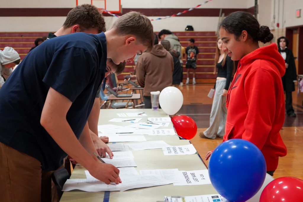 Students visited the gymnasium, which had been decorated and organized to resemble a polling station, throughout the school day on Monday and Tuesday to cast their ballot. The mock ballot, while not as extensive as an official election ballot, allowed students to make their voices heard in the presidential, Senate, and U.S. House of Representative races. Students were also asked a referendum question.