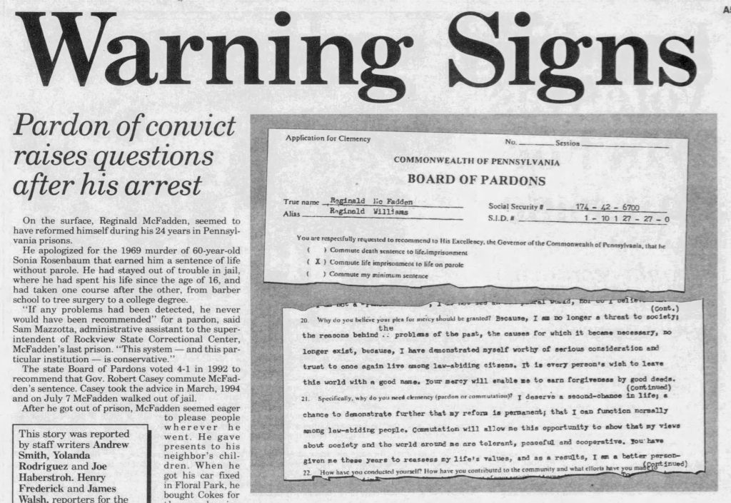 But the year McFadden’s application sat on Casey’s desk led to procedural mishaps, and by the time he signed it, parole officials incorrectly released McFadden straight to the public instead of into a two-year work release program.