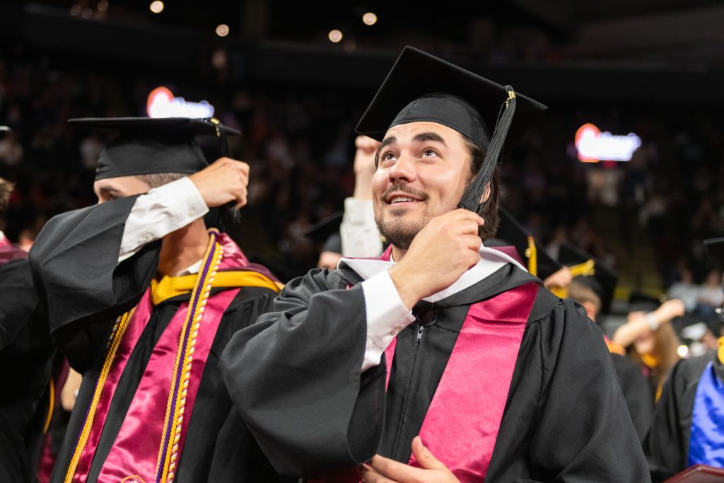 After graduates received their associate, bachelor’s, master’s, and doctoral degrees, the ceremony concluded with a benediction prayer led by Rev. George Osei Ababio ’25, who earned his Master of Business Administration degree at the ceremony. A scrolling list of names of every graduate appeared on video boards in the arena as students and families exited, cheering and posing for one last set of celebratory photos.