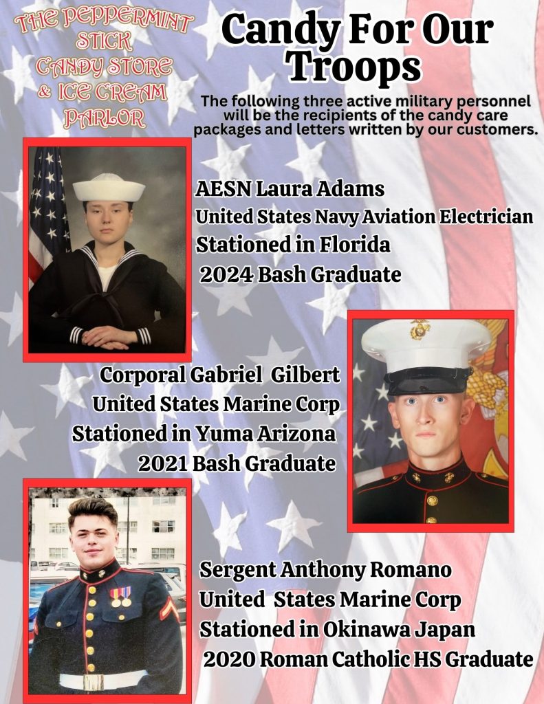 “For the past decade, our ‘Candy for Our Troops’ event has been a meaningful way for our community to show its gratitude to the brave men and women who serve our country,” said Rachael Kehler, the owner of The Peppermint Stick. “This year’s ‘Candy for Our Troops’ event holds an extra special place in my heart. Laura Adams, who once worked right here at the store during her high school years, is now serving our country in the U.S. Navy. I couldn’t be prouder of all she has accomplished. It’s truly an honor to support her and all our local heroes.”