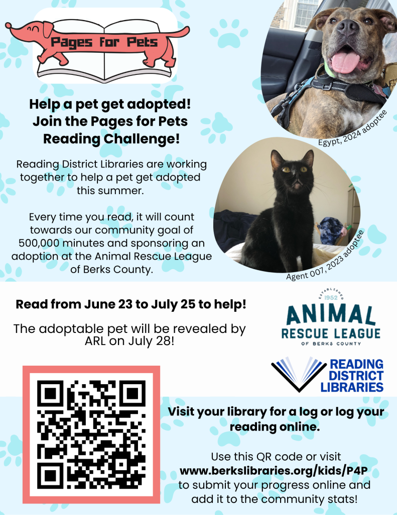 This summer, Berks County readers are invited to help a shelter pet find a forever home — just by reading. The third annual Pages for Pets program challenges the community to read a collective 500,000 minutes, unlocking a fully sponsored adoption for one lucky animal at the Animal Rescue League of Berks County.