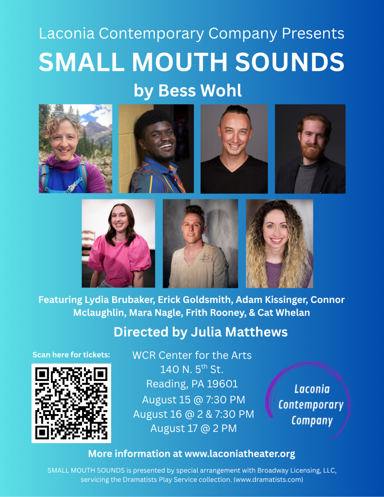 Laconia Contemporary Company is pleased to announce the cast and performance details for Small Mouth Sounds by Bess Wohl. Performances will take place on Friday, Aug. 15, at 7:30 p.m., on Saturday, Aug. 16, at 2 p.m. and 7:30 p.m., and on Sunday, Aug. 17, at 2 p.m., at WCR Center for the Arts, 140 N. 5th St., Reading. Free parking is available behind the building.