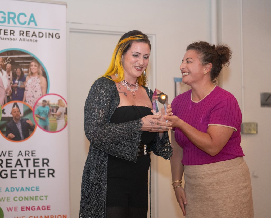 Artist Yenna Hill receives her Building Berks Award from GRCA President & CEO Lucine Sihelnik. Hill’s Moss + Douglass Mural won in the new-this-year Public Art category.