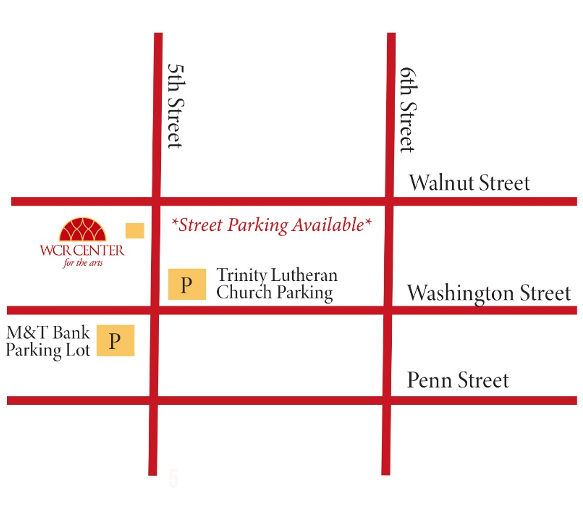 Trinity Lutheran Church and M&T Bank offer free off-street parking during WCR Center for the Arts events. Street parking is also available. Special thanks to Trinity Lutheran Church and Alan Shuman Group for these off-street parking options.