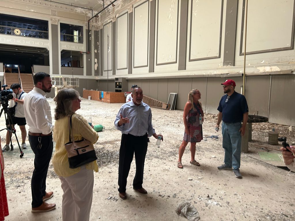 Pictured above: Reading Mayor Eddie Morán and State Rep. Manny Guzman (D., Berks) lead local officials on a tour inside the former Reading Trust Company building on Penn Street to promote a new redevelopment tool. Photo courtesy of Hanna Holthaus/Spotlight PA