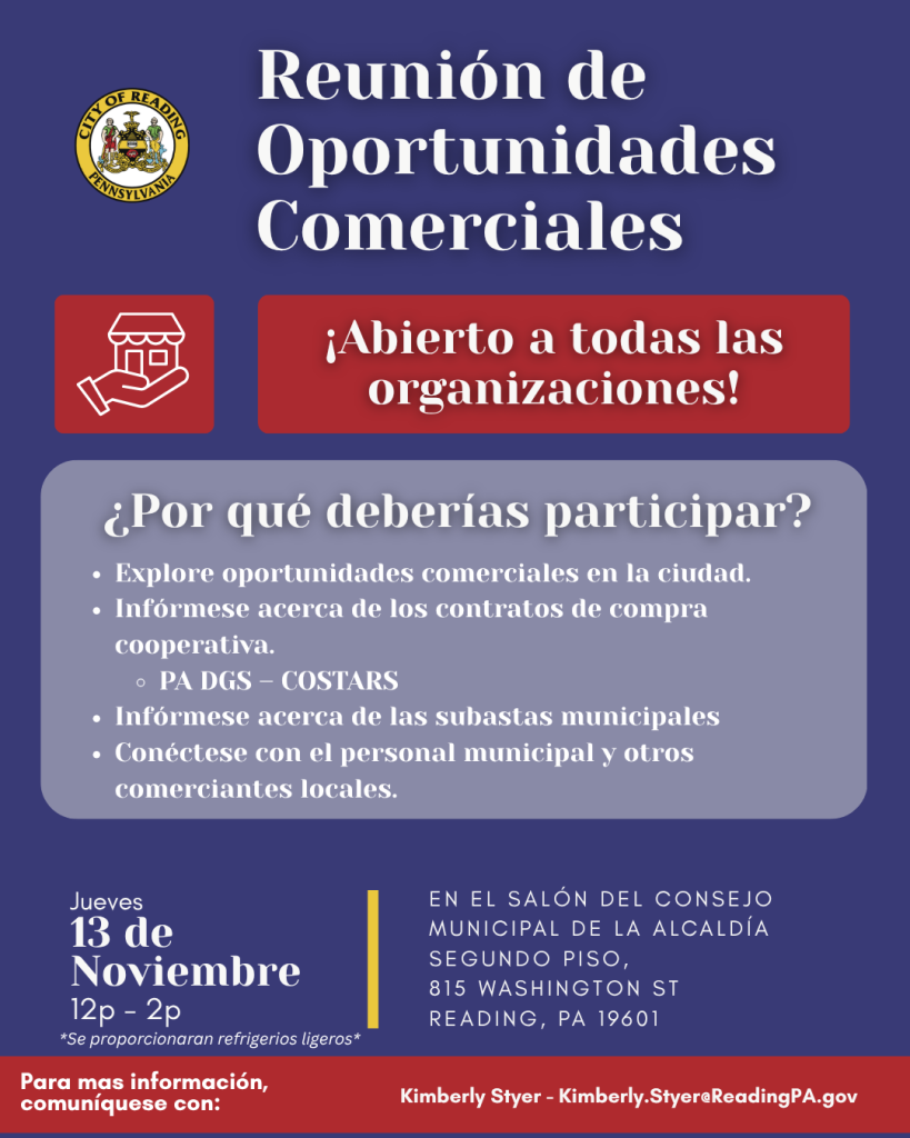 The City of Reading invites all local businesses to attend a Business Opportunity Meeting on Thursday, Nov. 13, from noon to 2 p.m., in City Hall Council Chambers, 815 Washington St., Reading.