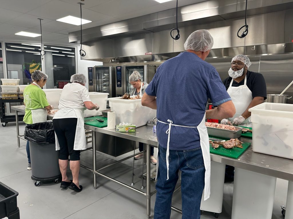 The menu for the heat-and-eat-ready meals — featuring smoked turkey with house-made gravy, sweet potato mash, green beans, and cranberry sauce — was created by the Community Kitchen’s culinary team, chefs Melanie Galarza, George Adams, and Chris Kochel. Meals were prepared and assembled by the chefs, staff, and volunteers over the course of October.
