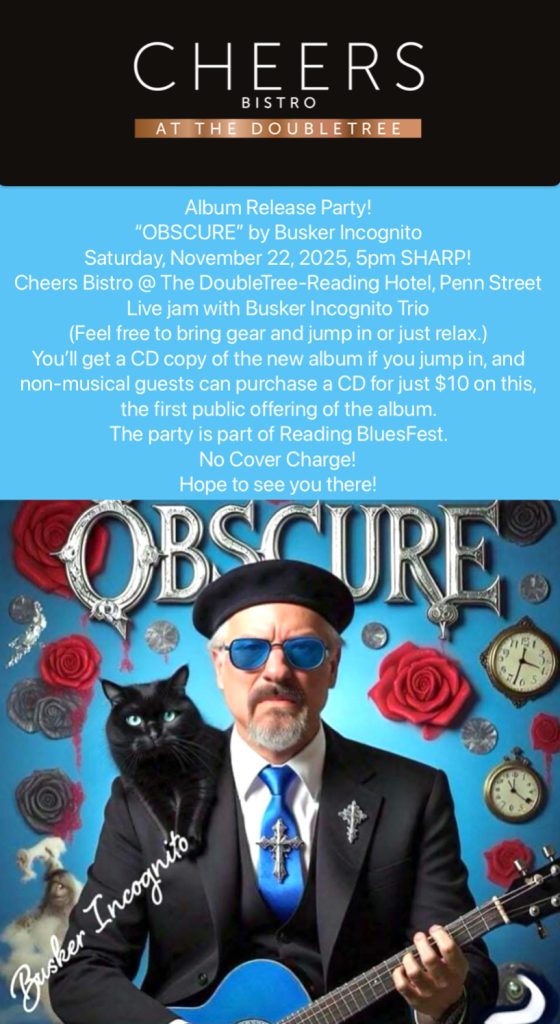 As a part of Reading BluesFest, presented by Berks Arts, Cheers Bistro, in the DoubleTree Hotel by Windham, Reading, will host the official album release party. The party and jam will offer live music by the Busker Incognito Trio of Dave Kline, John King, and Chuck Steinle. All are invited. See the invitation below for more information.