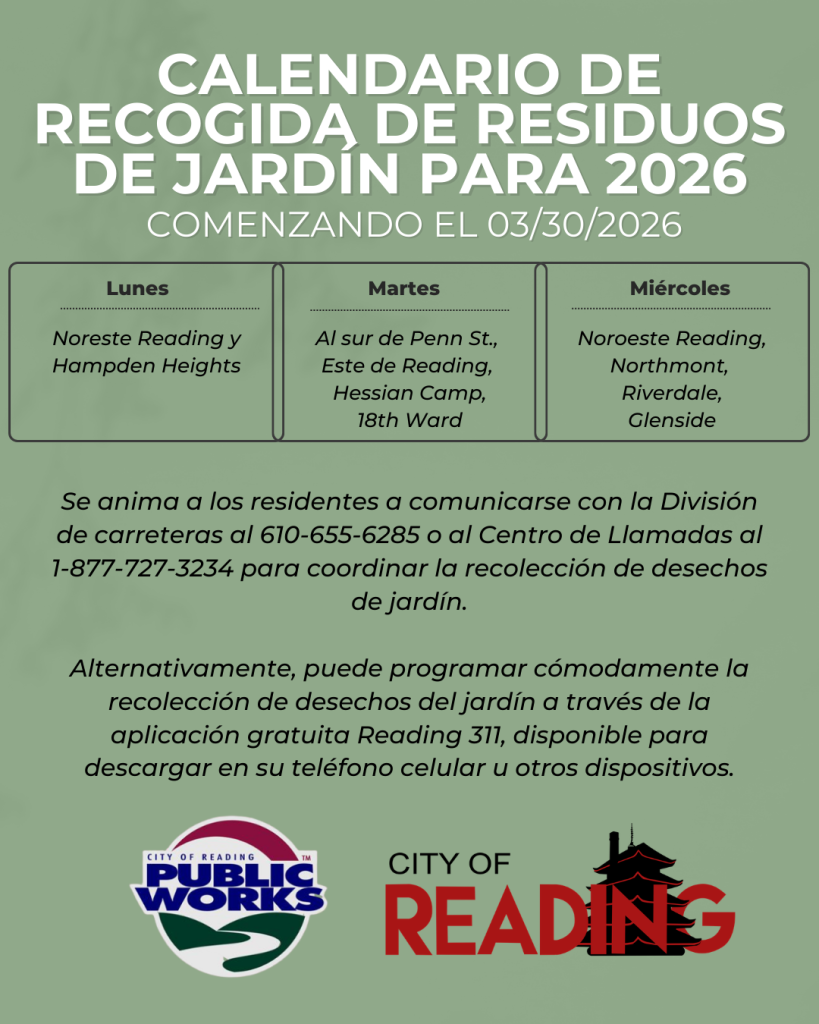 The City of Reading’s Yard Waste Collection program will begin on Monday, March 30, and continue through the spring, summer, and fall seasons. Residents are encouraged to schedule their yard waste collection in advance to ensure timely pickup.