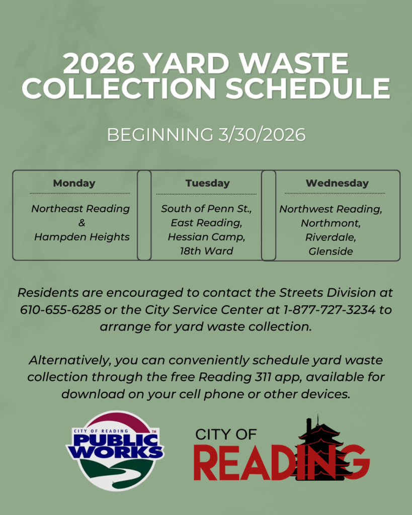 The City of Reading’s Yard Waste Collection program will begin on Monday, March 30, and continue through the spring, summer, and fall seasons. Residents are encouraged to schedule their yard waste collection in advance to ensure timely pickup.
