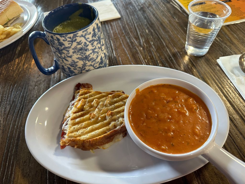 For her meal, Julie had a soup and sandwich combo with a hearty tomato soup and a grilled cheese with the addition of bacon. Julie loves bacon, and it gives the grilled cheese an added crunch and savory notes.