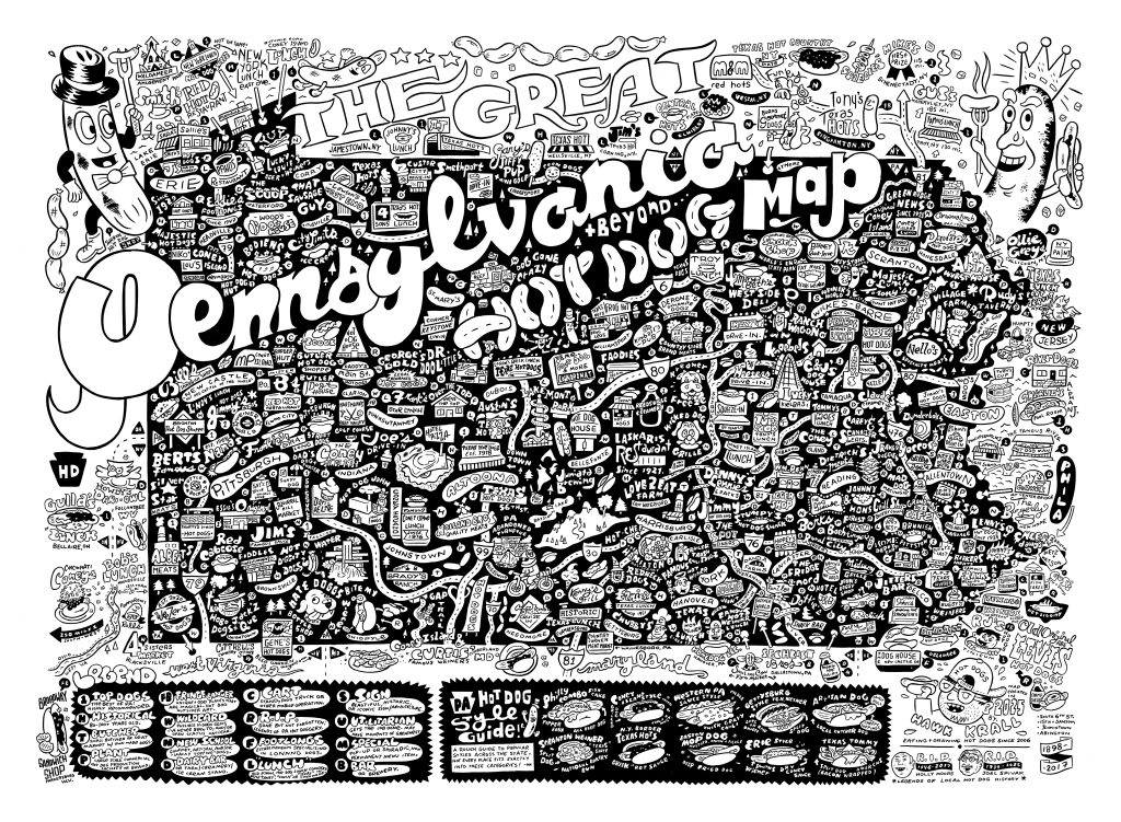 Krall depicts these lesser-known varieties and many, many more on his highly detailed statewide map, confidently dubbed “The Great Pennsylvania Hot Dog Map.”