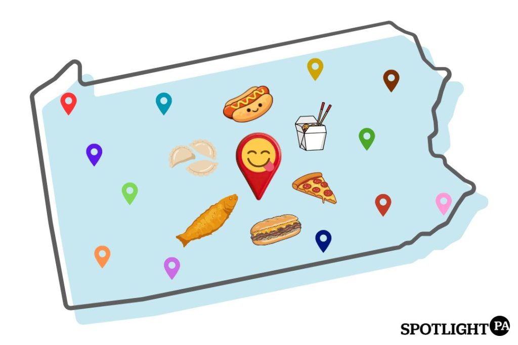 Pictured above: Illustration of Pennsylvania with select food items and location pins placed across the state. Photo courtesy of Asha Prihar / Spotlight PA