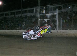 The red had to be thrown on the fourth lap after Doug Manmiller tooked a violent flip along the homestretch coming to a rest on the catch fence. He was uninjured, however, the car was destroyed. Also eliminated since they were left with nowhere to go were Richie Hitzler and back-to-back feature winner Brett Kressley. When action resumed Swinehart was still first with Weiss, Hirthler, D. Swinehart and Steuer completing the order.