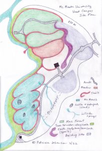 “My plan for McMaster University’s new research campus in Hamilton, Ontario (2019-2022) is based in nature, and my goal has been to design the entire project as ‘Land Art’ encompassing 45 acres—a massive swath of territory within an urban setting. ‘McMarsh,’ is an extensive mosaic of wetlands that would replace a thousand-car parking lot with ponds, marsh, and wet woodlands, all linked together and deployed to purify stormwater and provide food and habitat to birds, waterfowl, amphibians and turtles. Plants have been selected to remove specific pollutants from the water, as well as frame educational and research interests.