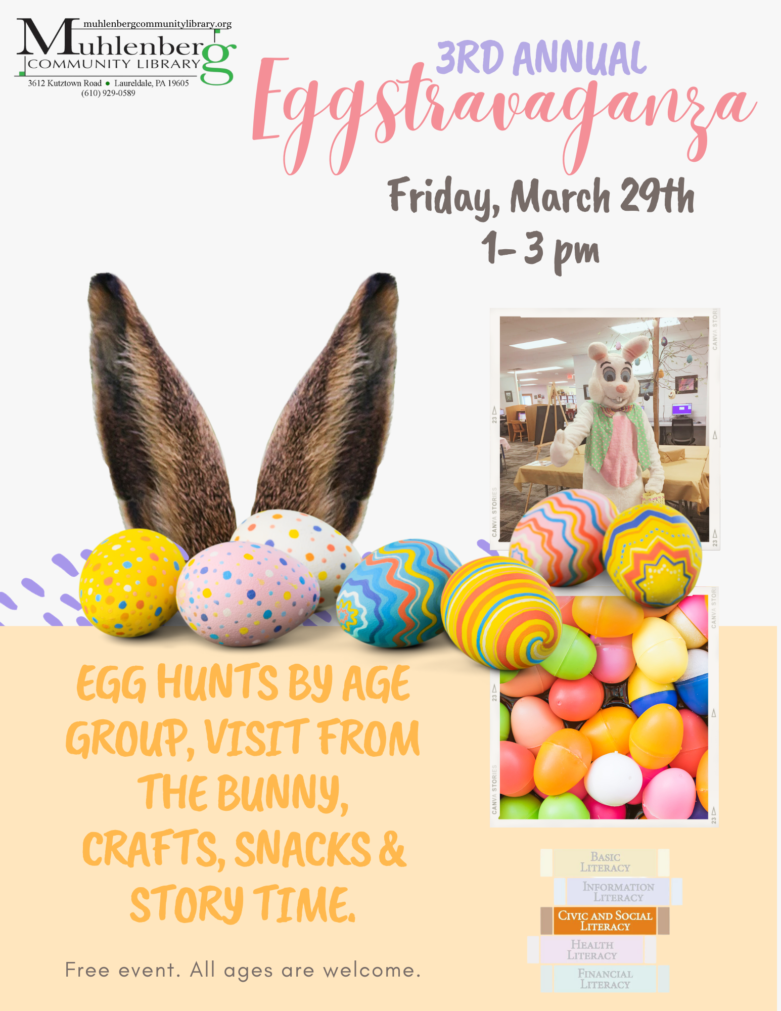 Bring the whole family to Muhlenberg Community Library for our 3rd annual Eggstravaganza! This event features egg hunts separated by age group, a visit from the Easter bunny, crafts, snacks and story time. This event is free and open to all ages. No registration necessary.