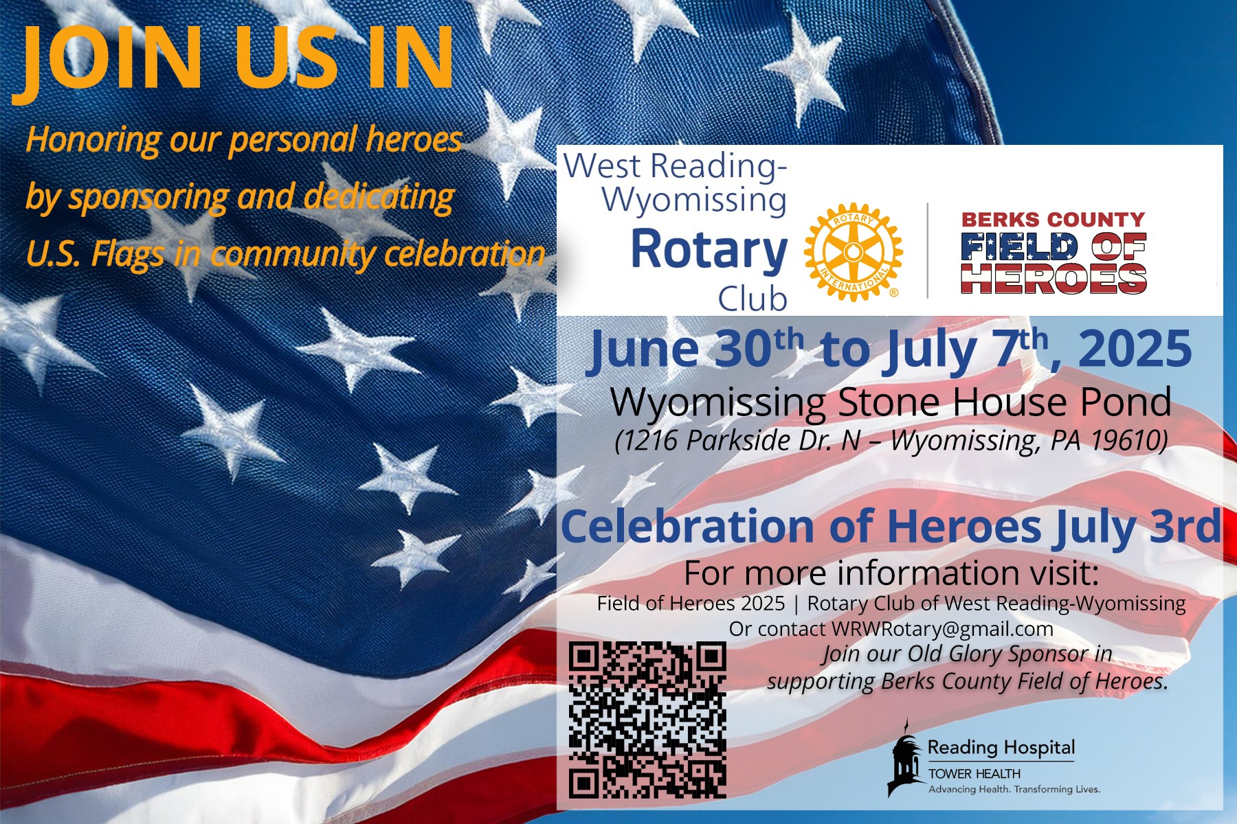 Join us for an inspiring event as United States flags proudly wave at the Wyomissing Stone House Pond June 30 thru July 7, 2025. This moving display will unite our community in a heartfelt patriotic tribute, honoring the extraordinary heroes in our lives. The Celebration of Heroes Ceremony will be July 3, 2025, at 1:00 PM
