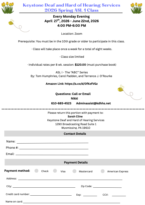 Keystone Deaf and Hard of Hearing Services will host its 2026 Virtual Spring ASL 1 Class every Thursday evening from April 2 to May 21, from 6:30 p.m. to 8:30 p.m., on Zoom.