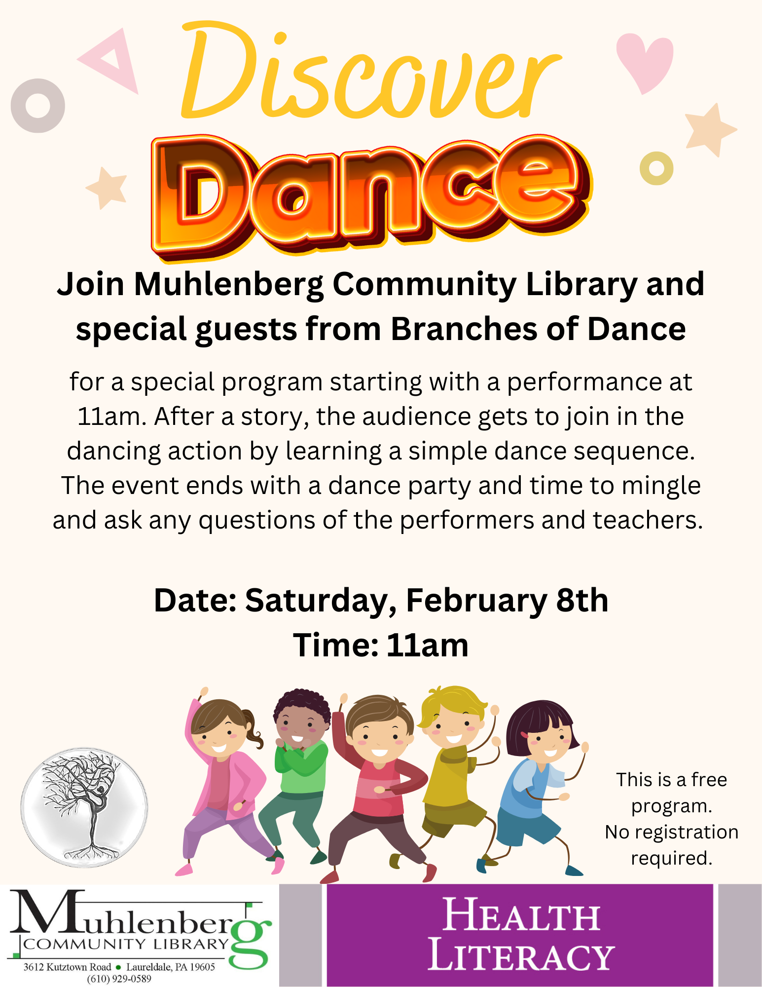 Discover Dance with the Branches of Dance dance studio! Come out to Muhlenberg Community Library for a special program starting with a performance at 11am. After a story, the audience gets to join in the dancing action by learning a simple dance sequence. The event ends with a dance party and time to mingle and ask questions of the performers and teachers from Branches of Dance.