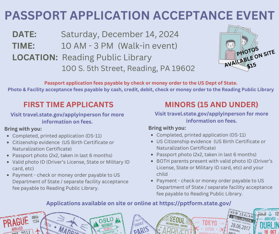 Back by popular demand, the Reading Public Library is offering another Passport Application Acceptance Event at its main library on 100 S 5th Street in Reading. No appointment is necessary, […]
