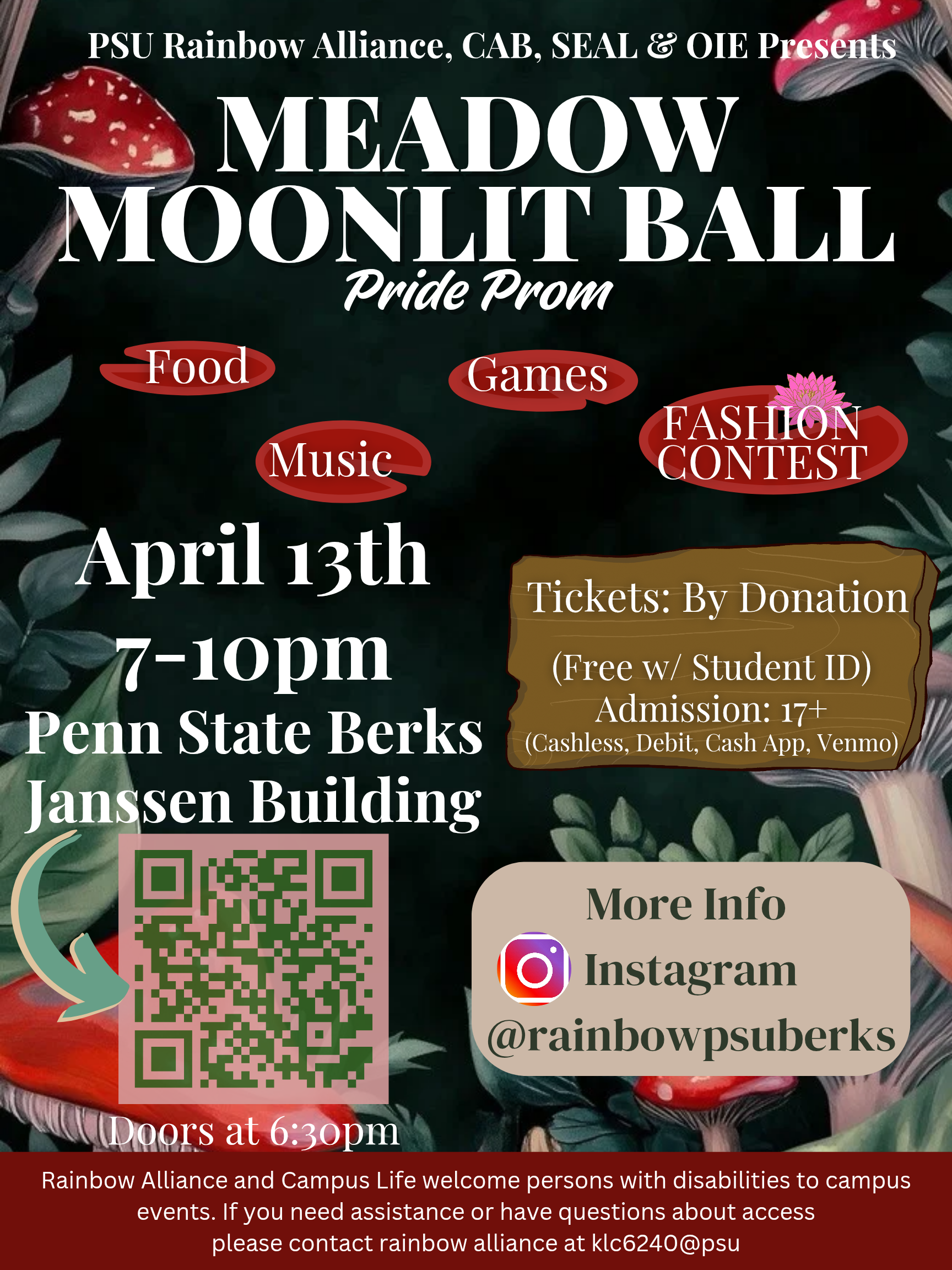 Please join us at the Meadow Moonlit Ball, where all are welcome. Be transformed into a luscious forest full of beauty and wonders. Delectable food and drinks, as well as fun games like trivia, are open to all. Don’t forget to bring a dance partner!