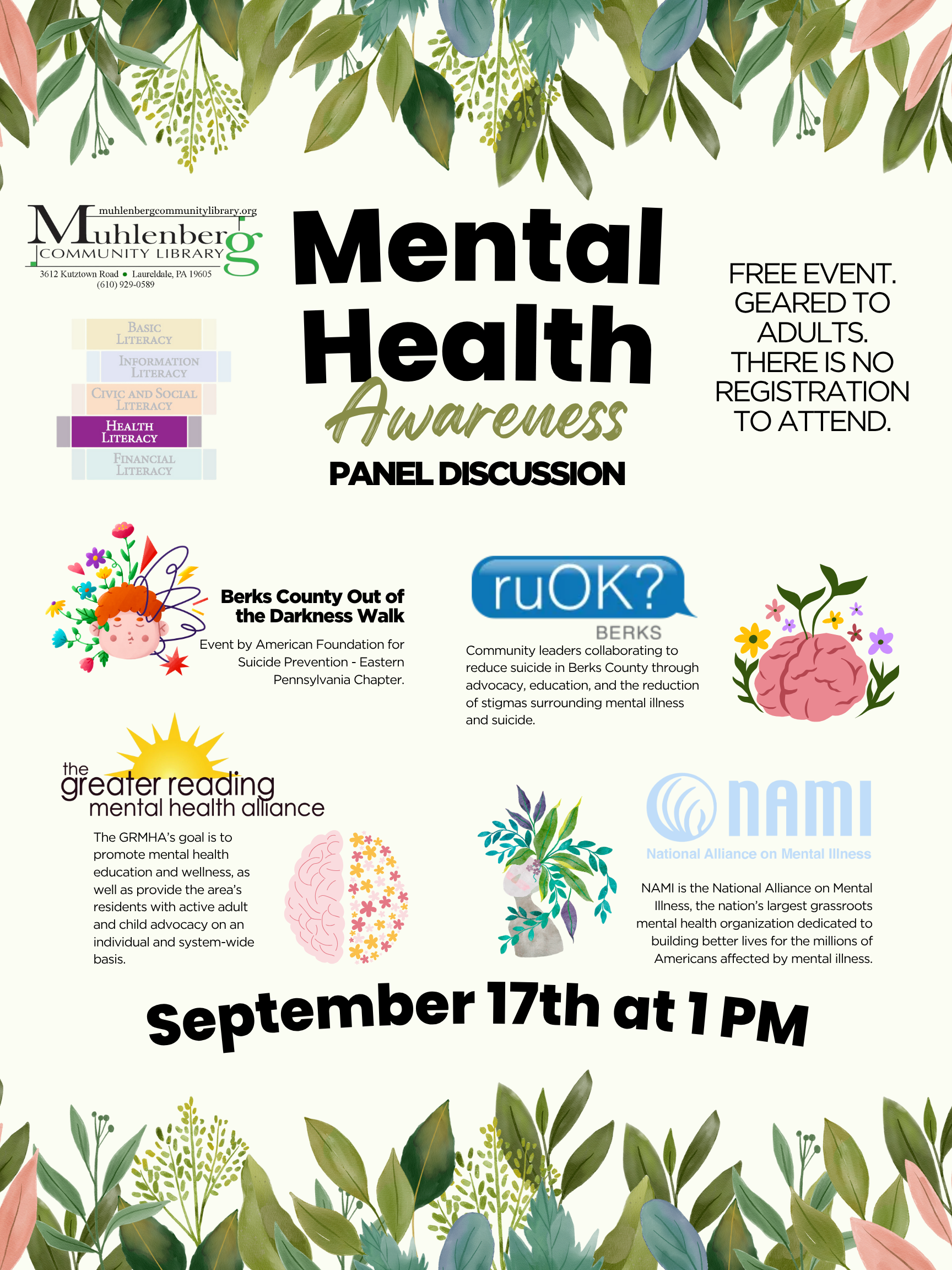 Join Muhlenberg Community Library for a panel discussion and Q&A regarding mental health and suicide prevention. The panelists for this event are the National Alliance on Mental Health (NAMI,) the Greater Reading Mental Health Alliance (GRMHA,) RuOK? Berks, and Berks County Out of the Darkness Walk.