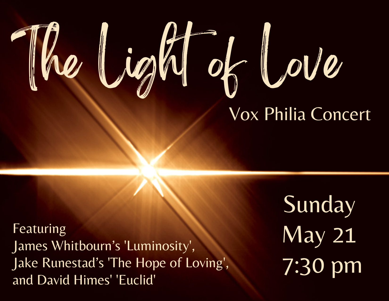Join us on Sunday, May 21 at 7:30 pm for Vox Philia’s The Light of Love. The performance includes two major works by living composers: James Whitbourn’s Luminosity and Jake Runestad’s The Hope of Loving, in its regional premiere. The choir will also present the world premiere of Berks County composer David Himes’ Euclid.