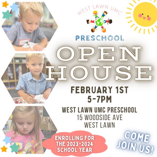 Come check out the West Lawn UMC Preschool! We welcome you to visit our classrooms, meet the Director and teachers, and tour our building on Wednesday, February 1.